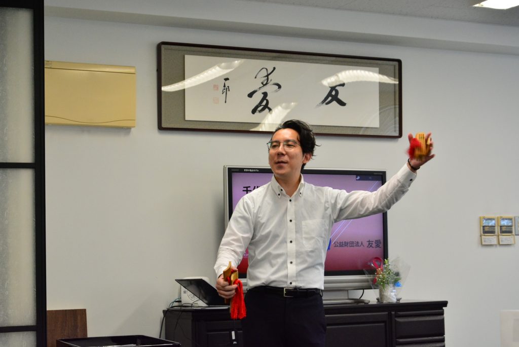 表彰式当日も、留学生と友愛の理事・ユニオンの皆さんとの交流があり、その後、暨南大学日本学院の小松先生による『快板』が披露されました。『快板』は、中国の伝統的な話芸で、木や竹の板を打ちながらリズムよく早口で語るもので、初めて見る人も多く、楽しく鑑賞しました。